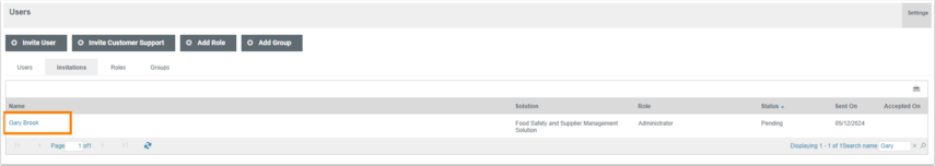 Once you have located the correct invitation, select the user invitation name. The name appears in blue text to indicate it is a link.