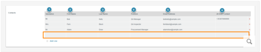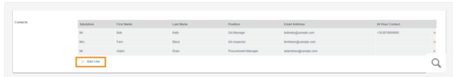 Scroll to the Supplier Contacts section on the Supplier page, then click Add Line to add a new Supplier Contact. A new line will appear for entering the contact details.
