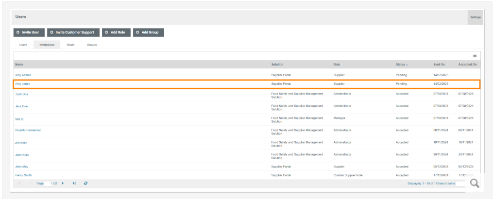 Note: The Invite User button invites both Internal and Supplier Portal Users. Be sure to select the correct Solution: choose Supplier Portal for Supplier Users to prevent them accessing your Internal site.