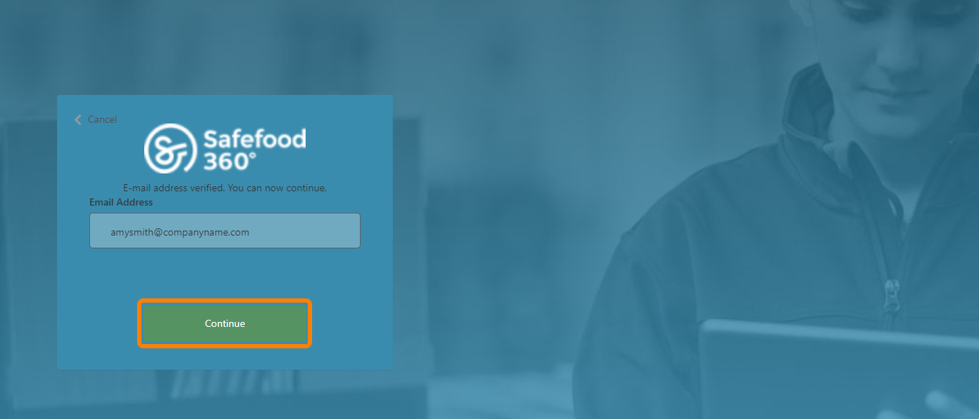 Once your email address has been verified, click the 'Continue' button to proceed with resetting your password.